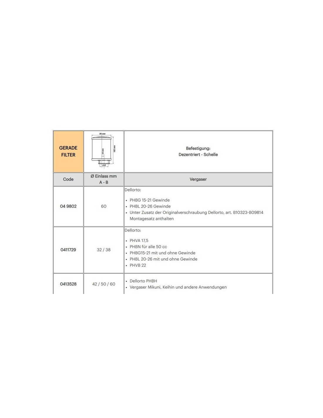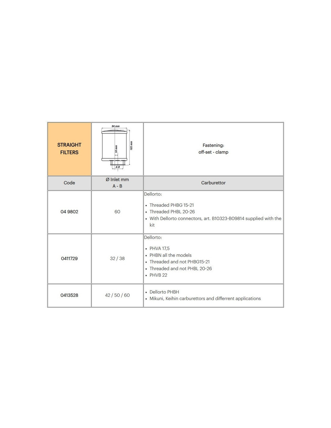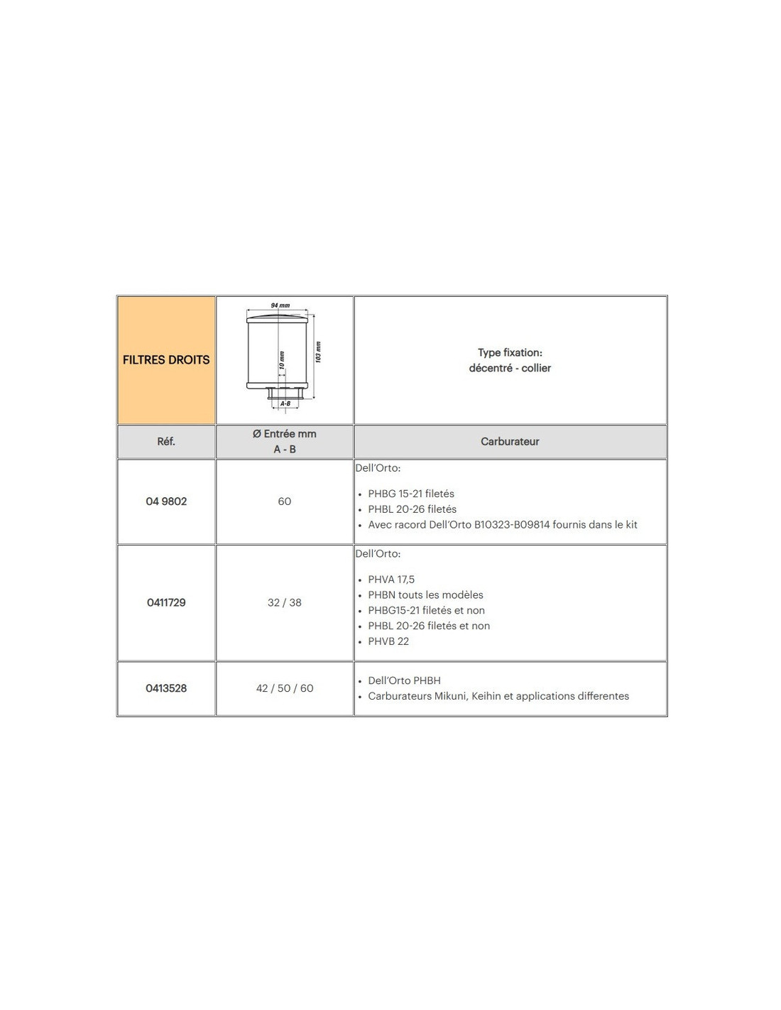 Filtre à air E13 avec élément de filtre en mousse de polyuréthane auto-lubrifiant, applicable pour les carburateurs dell'Orto, Mikuni, Khein et autres applications.