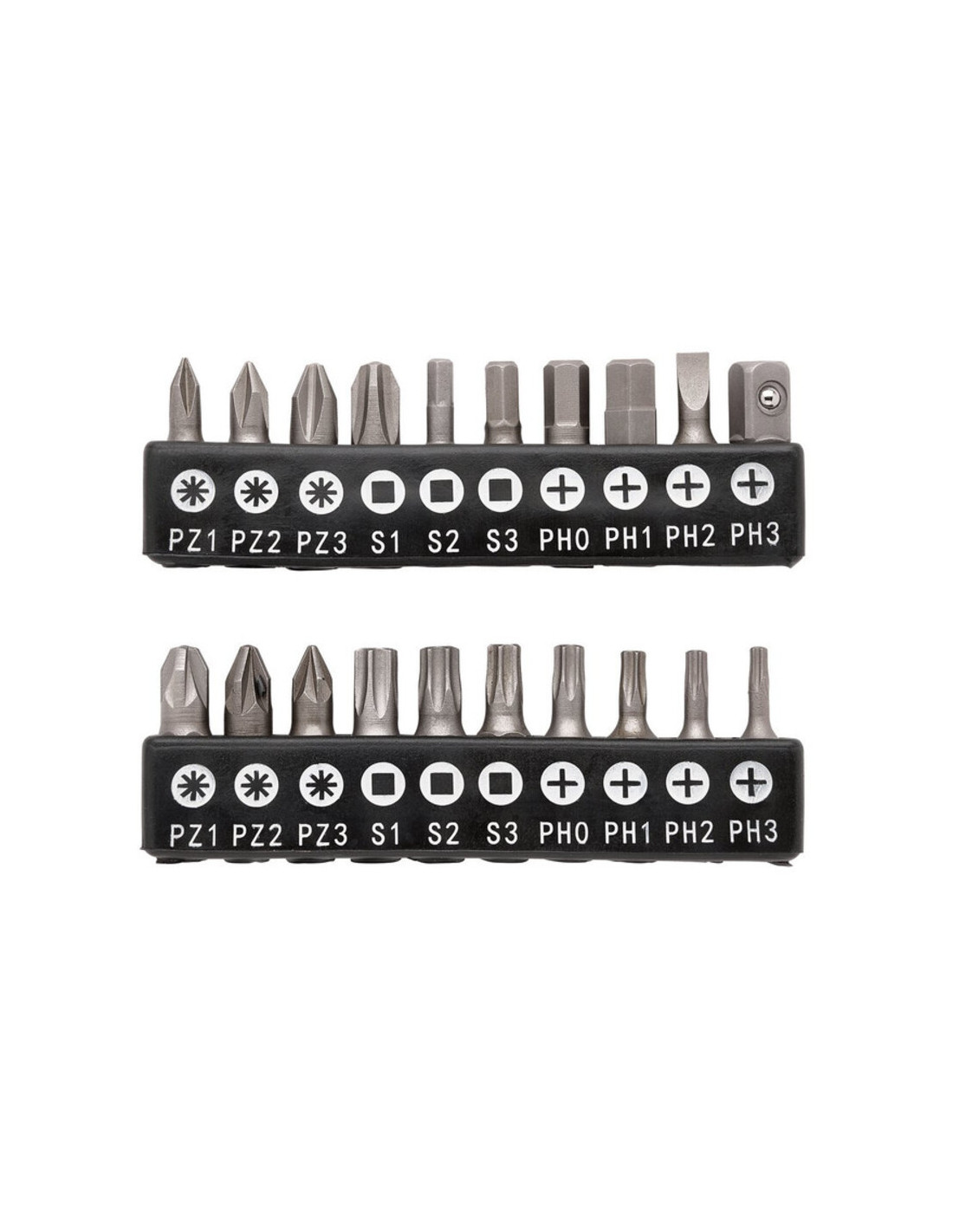 19 embouts hexagonaux : PH0, PH1, PH2, PH3, PZ1, PZ2, PZ3, SL4, T8, T10, T15, T20, T25, T27, T30, H3, H4, H5, H6