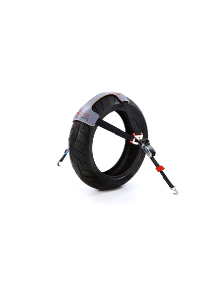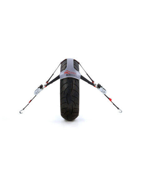 La sangle TyreFix® d'Acebikes est un set de fixation avec un système de sangle de fixation spécial permettant de sécuriser tout type de moto sur une remorque, un fourgon ou un camion.