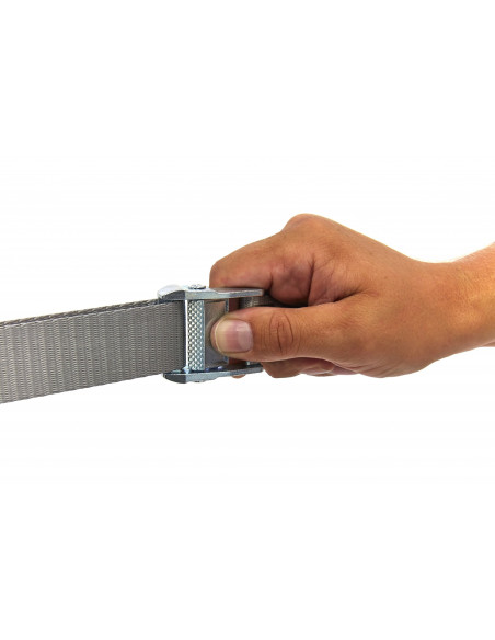 Les sangles en polyester gris-rouge de 300 cm de long sont équipées d’une boucle à came galvanisée de 5 cm.
